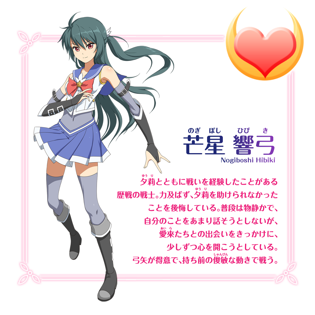 夕莉とともに戦いを経験したことがある歴戦の戦士。 力及ばず、夕莉を助けられなかったことを後悔している。 普段は物静かで、自分のことをあまり話そうとしないが、愛來たちとの出会いをきっかけに、少しずつ心を開こうとしている。 弓矢が得意で、持ち前の俊敏な動きで戦う。